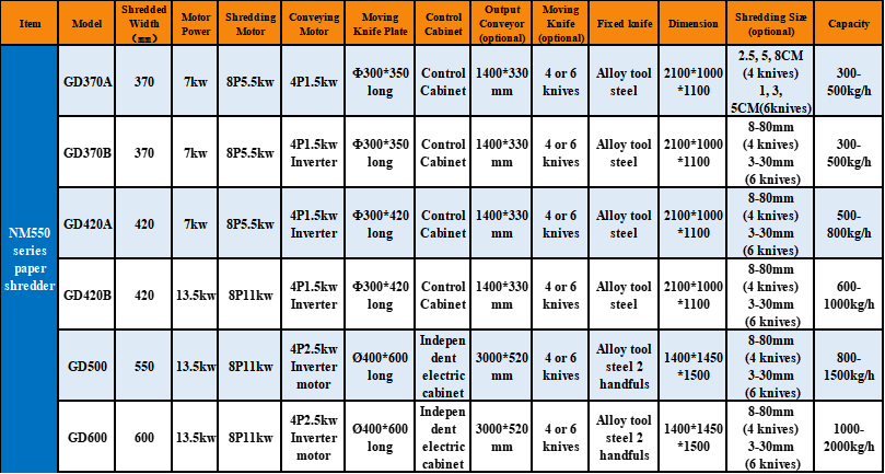 Swedish imports of wear-resistant alloy steel Weldar NM550 series of special alloy tool steel manufacturing, wear-resistant, long service life, suitable for a variety of shredding of classified media: the shredder main body using Q345B material welding, stress relief treatment, with good stability, impact resistance, vibration, to ensure the safe operation of the equipment in a long time heavy load. Shredding effect: according to customer requirements, customized discharge strips or discharge flakes (as above). Discharge method: external discharge conveying line or central suction duct can be connected. Shreddable: lignocellulose, paper, film, carton, etc.